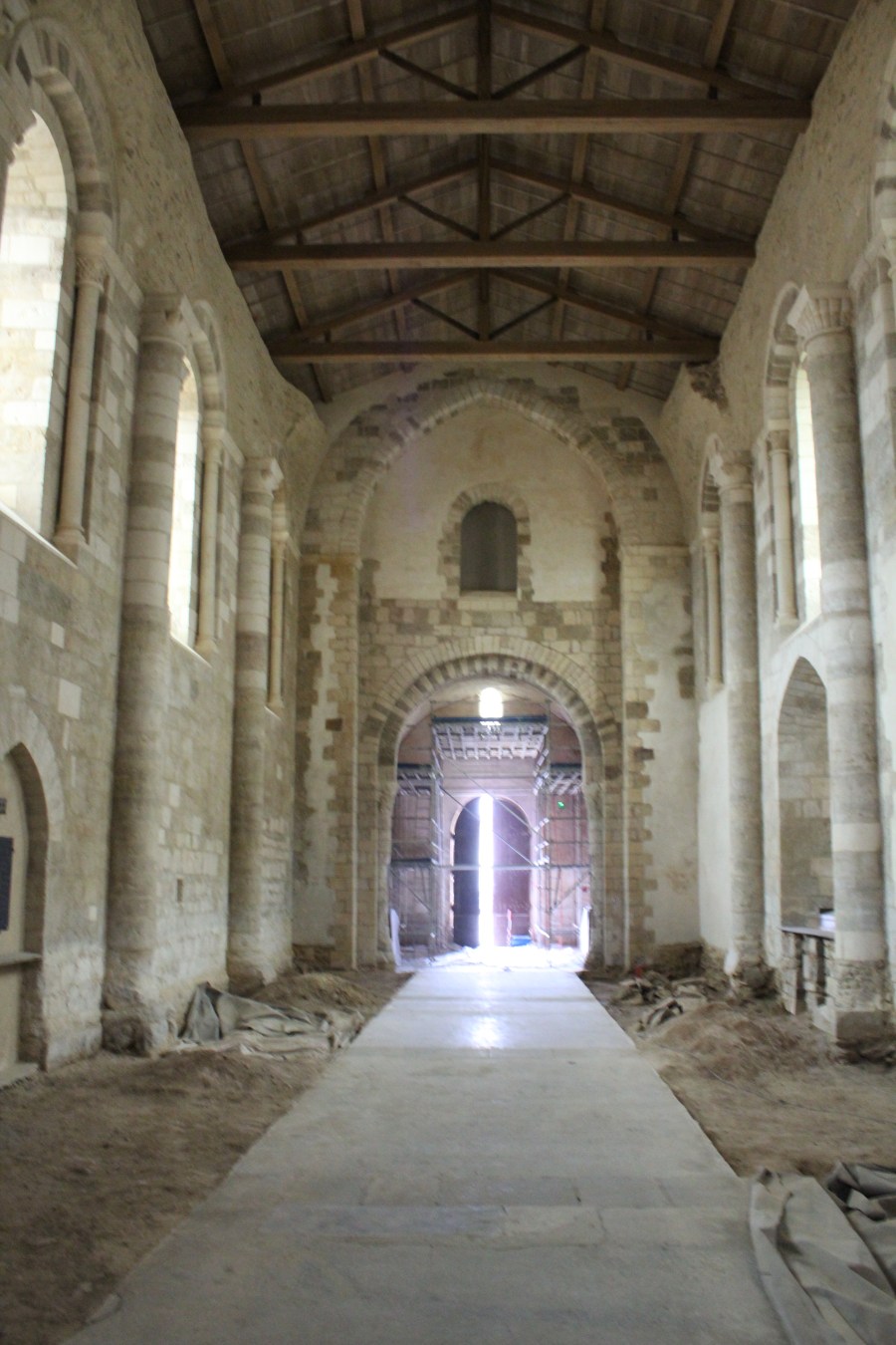 La reprise de la façade occidentale au XIXe siècle ne semble pas avoir entraîné la destruction totale de la façade antérieure : les arcs sont encore clairement harpés à la maçonnerie visible sous l’enduit du XIXe siècle. Les travaux du XIXe siècle ont donc surtout consisté dans le percement d’une porte et dans la réinterprétation de l’ornementation de la façade occidentale. Compte tenu de ces observations, sur un plan strictement archéologique, il pourrait s’avérer intéresser de déposer complètement les enduits de restauration du XIXe siècle masquant la face interne occidentale du narthex, afin de pouvoir observer d’éventuelles traces de maçonneries antérieures (porte, etc.), probablement romanes vus les liens stratigraphiques avec les arcades du narthex, et peut-être aussi pour comprendre l’organisation des accès à cet espace stratégique et son évolution au cours du temps. De la même manière, la dépose de l’enduit très grossier et datant probablement du XIXe siècle masquant la voûte de couvrement du narthex serait souhaitable pour pouvoir observer les vestiges antérieurs et comprendre l’articulation exacte entre le volume du rez-de-chaussée du narthex et la salle haute.