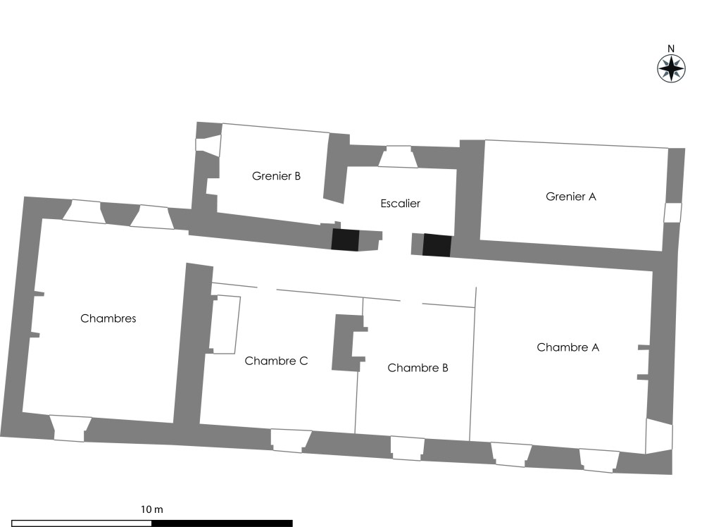 Par ailleurs, les observations réalisées montrent que l’appareillage mixte associant des lits de moellons de schistes barlongs avec des blocs cubiques de petit à moyen appareil correspondent aux maçonneries les plus anciennes du manoir. Des maçonneries de ce type se retrouvent en partie basse de la cuisine ainsi que dans la chambre A, à l’étage. Cette asymétrie pourrait révéler :